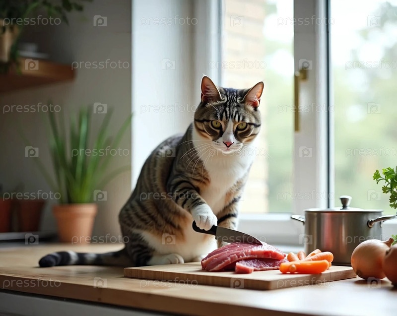 кот режет мясо