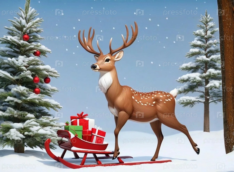 Олень стоит возле сани с подарками в лесу зимой