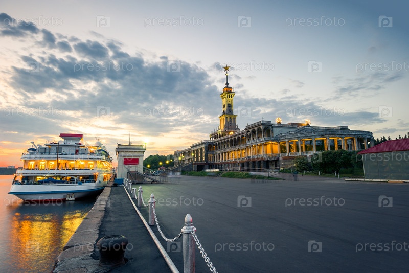 Вечерний вид на набережной Северной речной станции Москвы и пришвартованного круизного лайнера