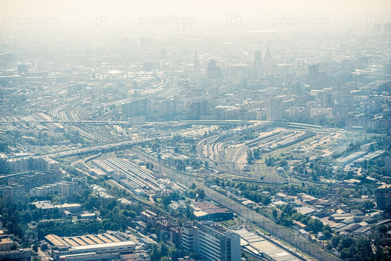 Птичий взгляд на городской пейзаж жилых зданий Москвы в смоге
