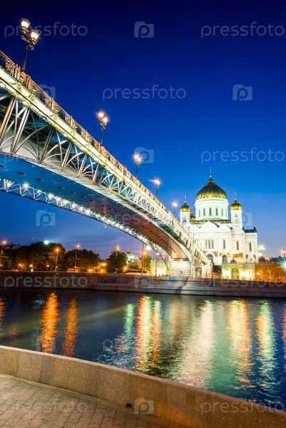 Православный собор Христа Спасителя и Патриарший мост через Московскую реку в ночное время
