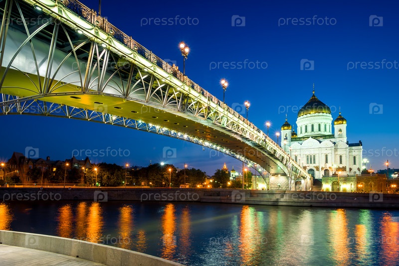 Православный собор Христа Спасителя и Патриарший мост через Московскую реку в ночное время