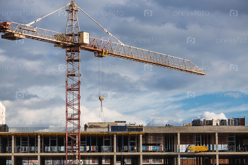 Строительство башенного крана в солнечный день. Строительство новых жилых кварталов. Новые здания. Выдающийся, Ленинский район, Московская область