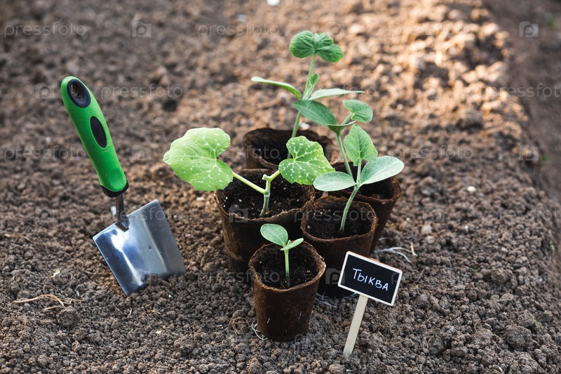 В землю сажают плечевые лопатки и тыквенные рассады. Концепция весеннего посадки овощей и сельскохозяйственных культур. Таблетка с надписью на русском языке: 'тыква'