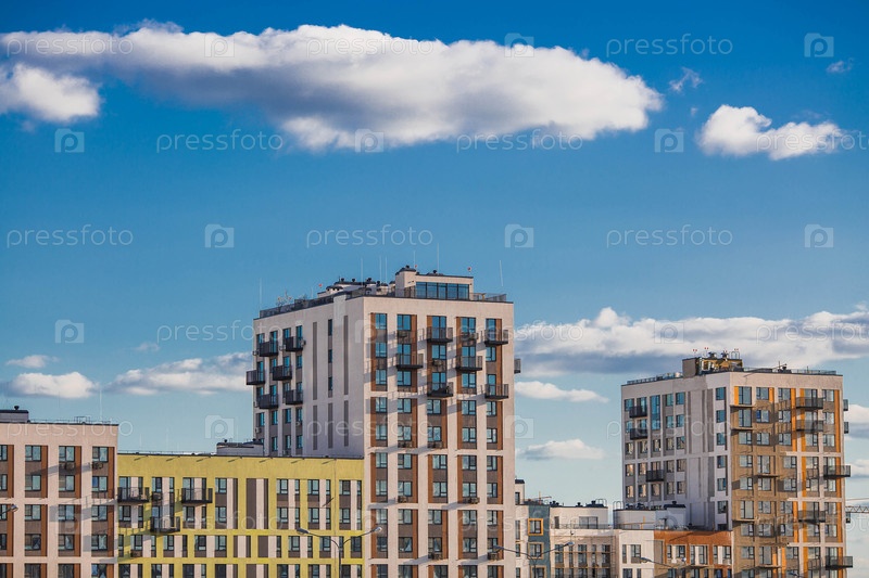 Современные многоэтажные жилые дома в солнечный день. Строительство новых жилых кварталов. Новые здания. Известный, Ленинский район, Московская область