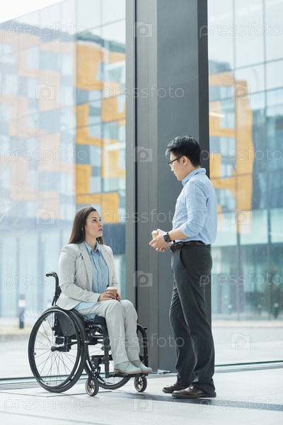 Молодая женщина в инвалидном кресле разговаривает с коллегой