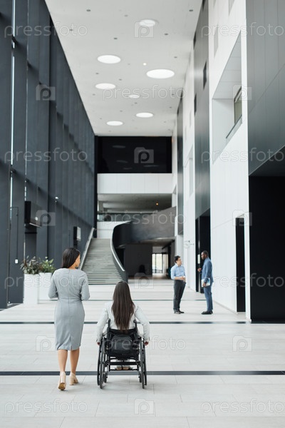 Молодая женщина в инвалидном кресле, экскурсирующая по офисному зданию