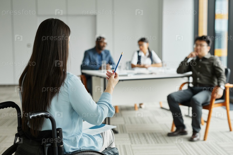 Деловая женщина в инвалидном кресле разговаривает с командой на встрече