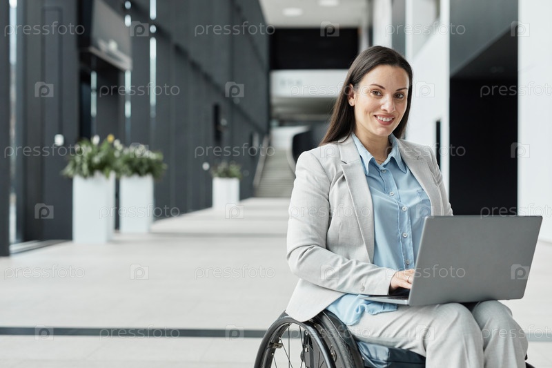 Молодая бизнесвумен в инвалидном кресле использует ноутбук
