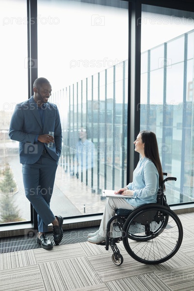 Женщина в инвалидном кресле разговаривает с коллегой на работе