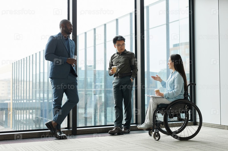 Деловая женщина в инвалидном кресле разговаривает с коллегами