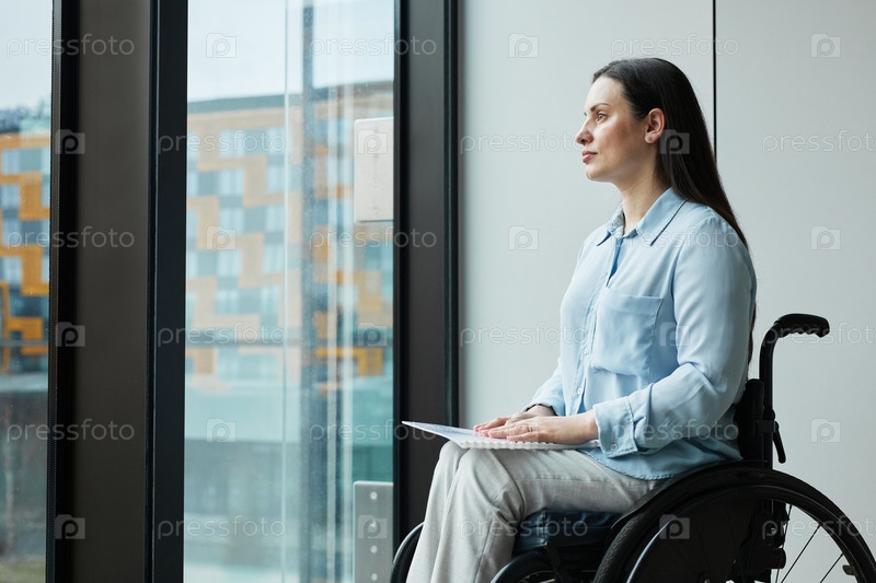 Молодая бизнесвумен в инвалидном кресле смотрит в окно