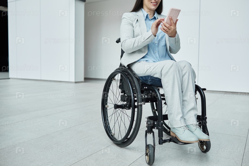 Молодая бизнесвумен в инвалидном кресле использует планшет