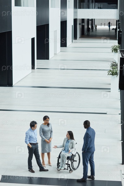 Разнообразная группа деловых людей в офисной вестибюле