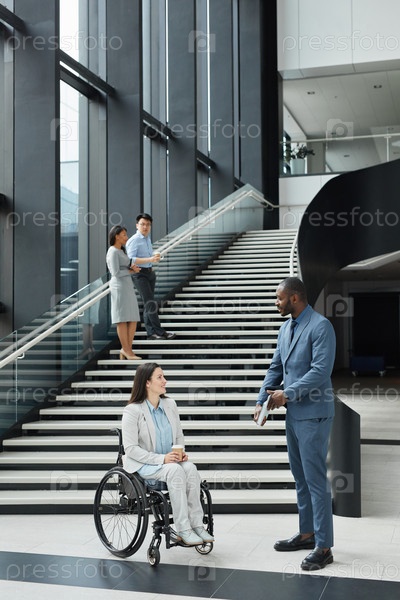 Деловая женщина в инвалидном кресле в современном офисном здании