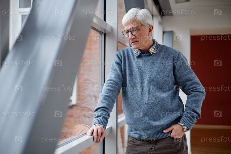 Старший профессор, стоящий в стеклянном коридоре
