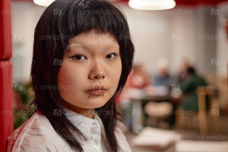 Молодая азиатская женщина с пирсингом лица смотрит на камеру