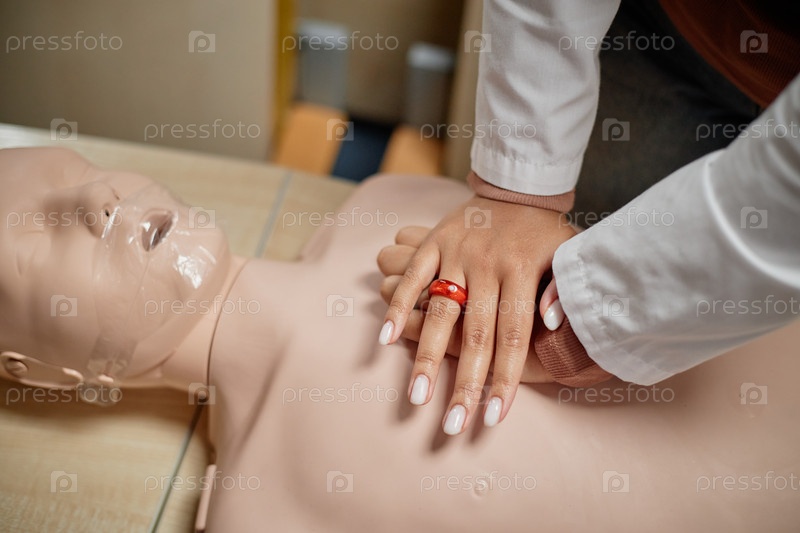 Студент практикует компрессии грудной клетки на КПР Black Dummy