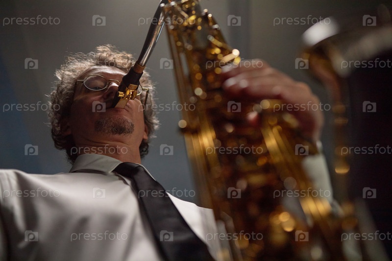 Зрелый мужской музыкант играет на саксофоне во время выступления на сцене