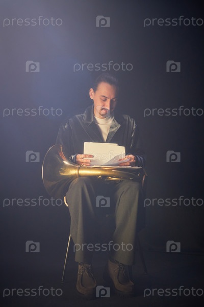 Хорнист пересматривает музыкальные ноты, сидя на стуле в черной студии со Spotlight Male