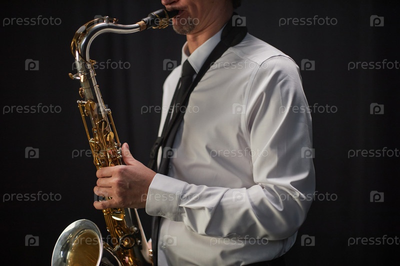 Музыкант в белой рубашке играет на саксофоне в студии против черных штор