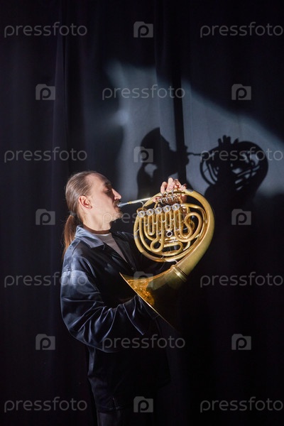 Музыкант, играющий на французском роге на сцене в центре внимания Casting Shadow on Curtain