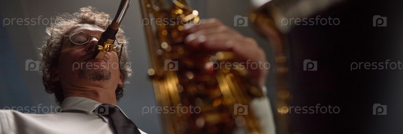 Header Image of Музыкант-мужчина играет на саксофоне во время джазового концерта на сцене