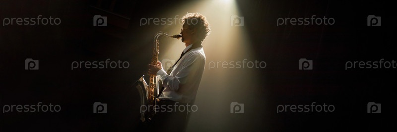 Header Image of Мужской джазовый музыкант играет на саксофоне под светом света в темноте
