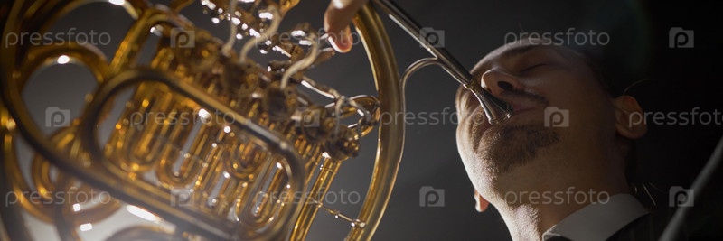 Header Image of Музыкант-мужчина играет на французском роге в центре внимания