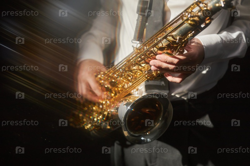 Музыкант, играющий джаз на блестящем саксофоне под фокусом внимания на сцене