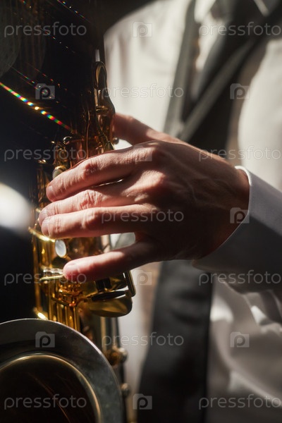 Музыкант, толкающий клавиши саксофона, играя музыку в контрастном свете на сцене мужчина
