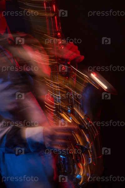 Саксофон в руках мужского музыканта, играющего джазовую музыку на сцене под неоновыми огнями