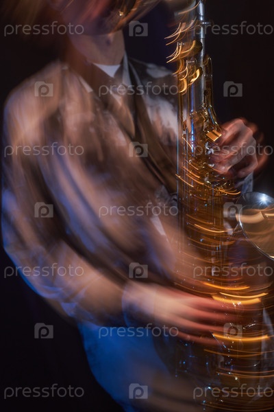 Саксофон в руках мужского джазового музыканта, выступающего на сцене с темным светом