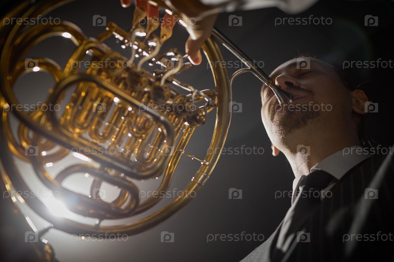 Музыкант-мужчина играет на французском роге с страстью, исполняя музыку в центре внимания