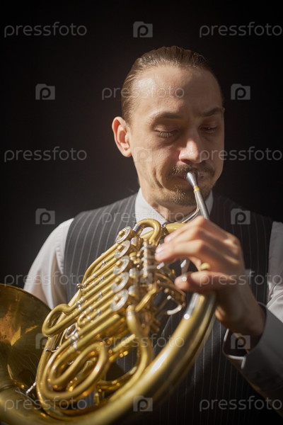 Музыкант играет на французском роге в ярком проекторе Свет на сцене мужчина