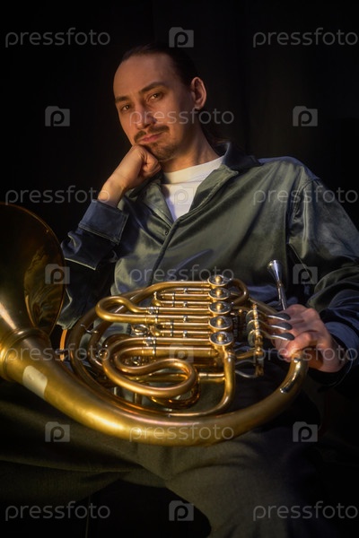 Портрет мужского игрока на французском роге, позирующего с инструментом, сидящим в тускло освещенной студии