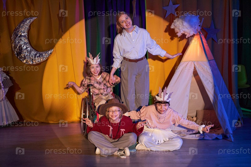 Учитель драматической школы с молодыми актерами, кланяющимися на сцене инклюзивного театра