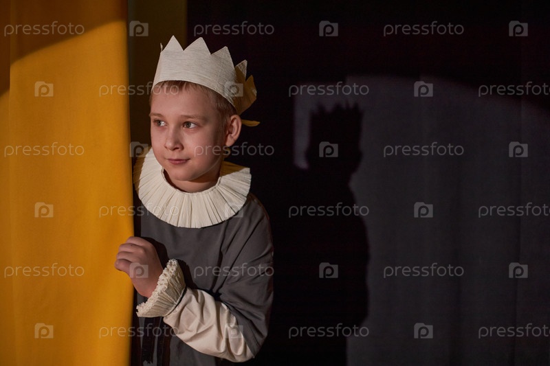 Мальчик в короне заглядывает из-за штор на сцене детского театра
