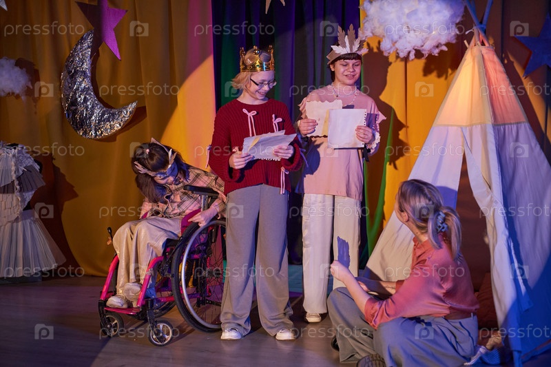Дети репетируют игру со школьным учителем на сцене инклюзивного театра