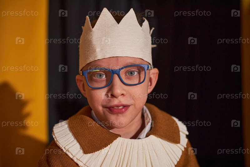 Портрет мальчика с очками, стоящего на сцене инклюзивного детского театра