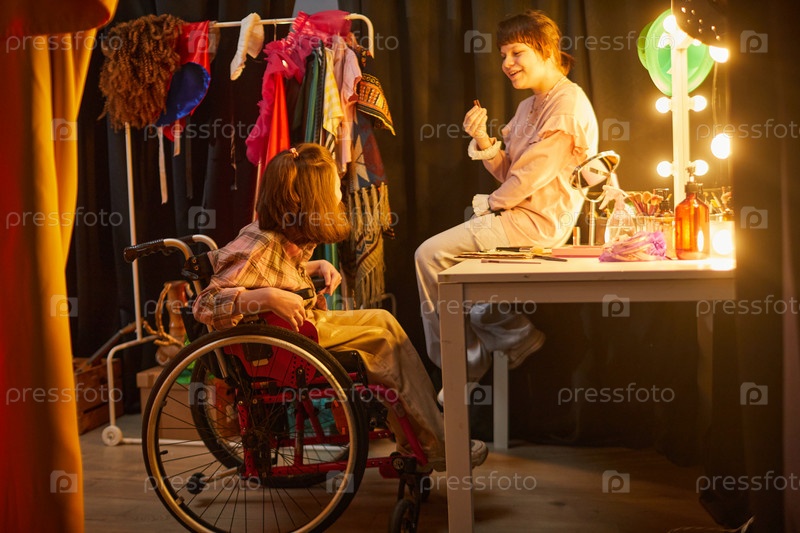 Молодая девушка в инвалидном кресле беседует с другом в детском театре