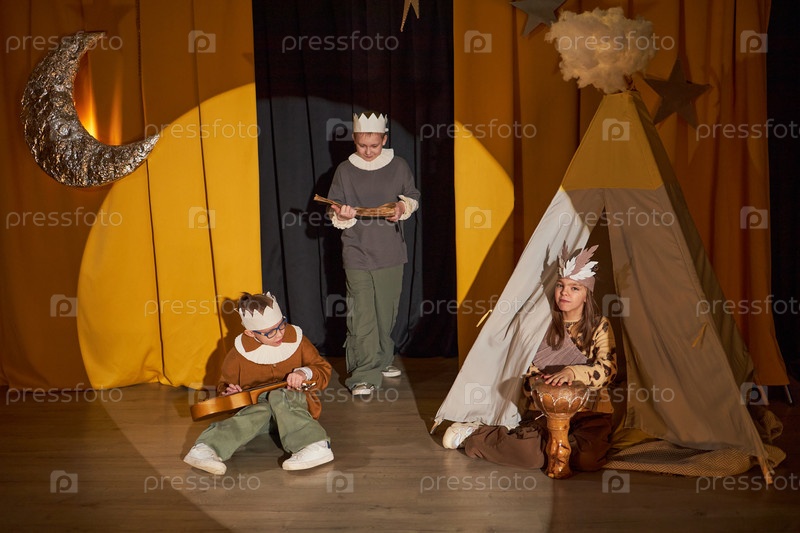 Дети играют музыкантов и короля в сказочной игре на сцене