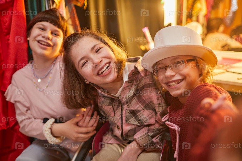 Портрет улыбающейся девочки в инвалидном кресле, позирующей с друзьями в театральной раздевалке