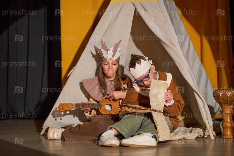 Дети читают книги и играют в укулеле на сцене инклюзивного детского театра
