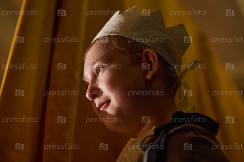 Мальчик в Crown Playing King заглядывает из-за штор в детском театре