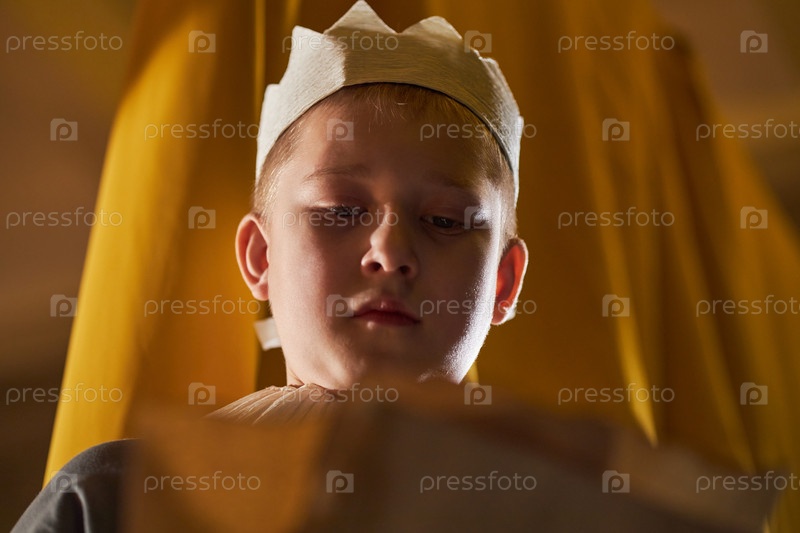 Портрет мальчика в короне, пересматривающий строки царя за кулисами детского театра