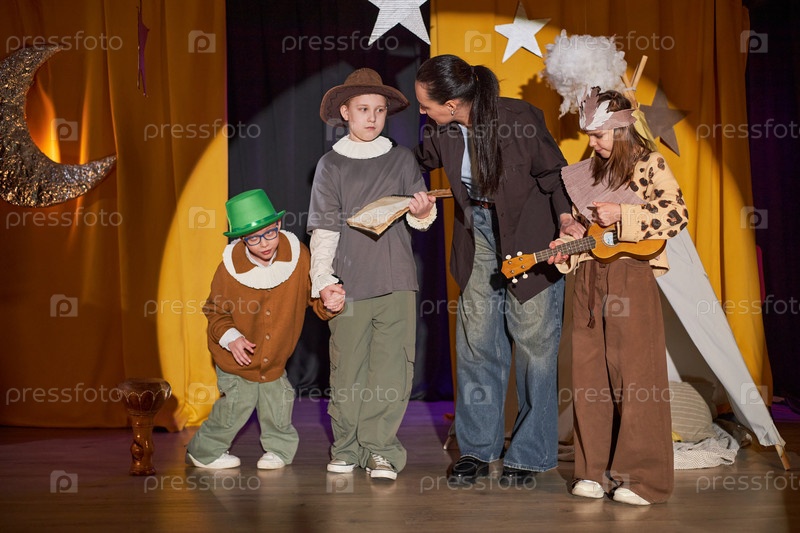 Учитель драматической школы поддерживает детей на сцене инклюзивного детского театра