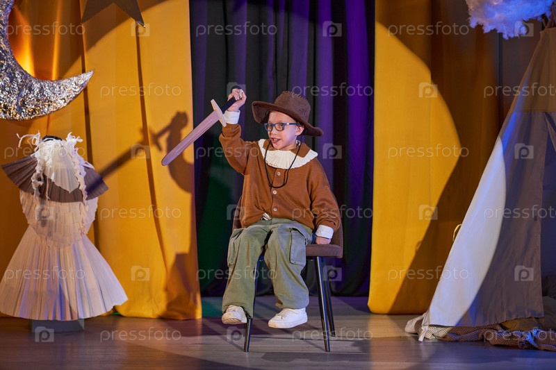 Маленький мальчик с очками, держащий меч, играющий на сцене инклюзивной драматической школы
