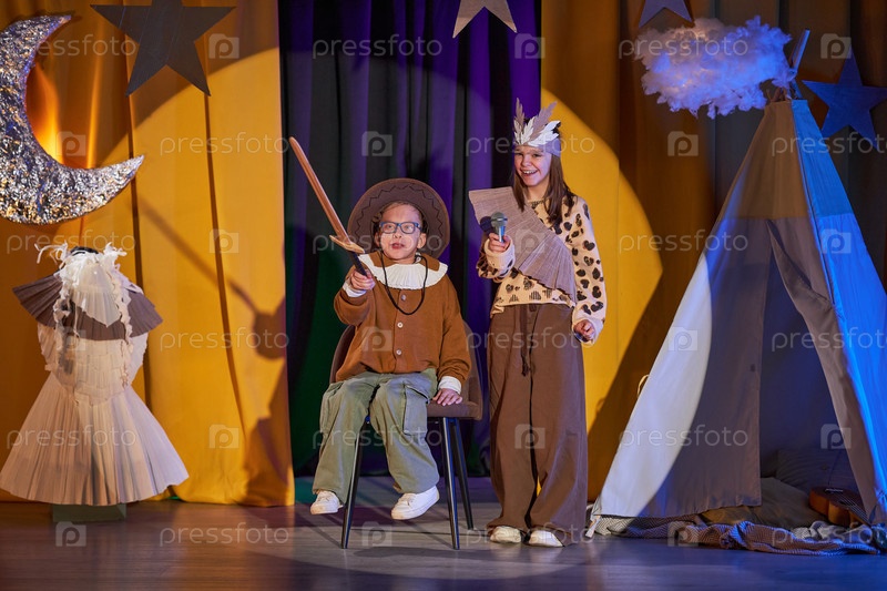 Счастливые дети в костюмах, держащие микрофон, действующие на сцене инклюзивной драматической школы