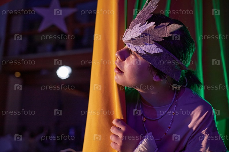 Девушка в костюме заглядывает из-за штор во время пьесы в детском театре